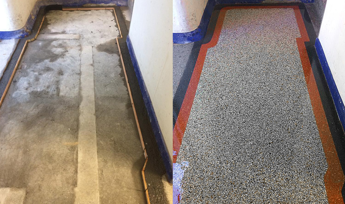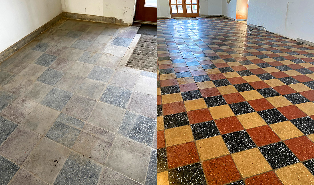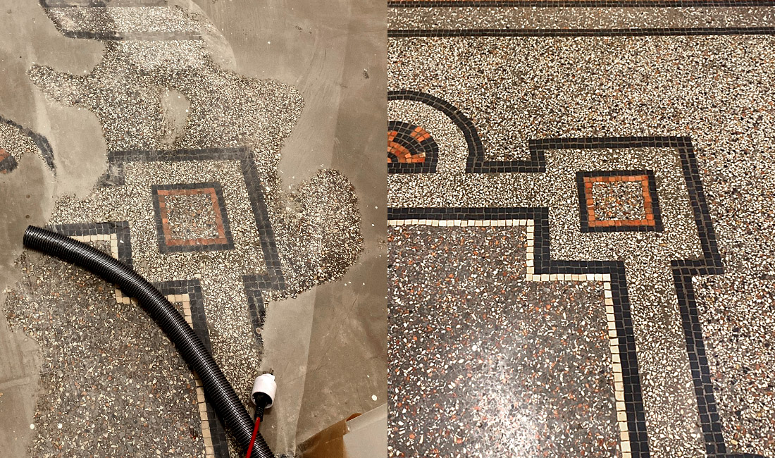 Und da Terrazzo nicht nur äußerst beständig ist, sondern auch gut reproduzierbar, lassen sich oft beschädigte Belege mit relativ wenig Aufwand (und Kosten) durch eine Sanierung oder sogar nur eine Reinigung wiederbeleben. Sehen Sie hier, was sich aus solchen vermeintlich verlorenen Böden noch rausholen lässt!