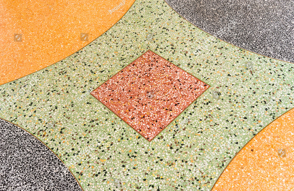 An diesem Verlegebeispiel sieht man gut die zahlreichen Möglichkeiten bei der Wahl von Form, Farbe und Oberflächenstruktur, die mit Terrazzo möglich sind.